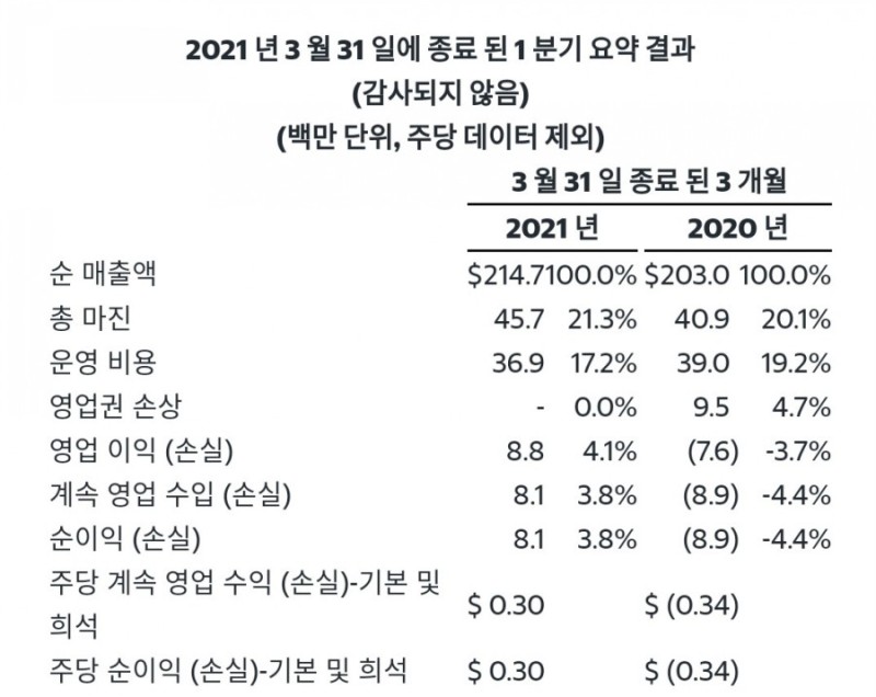 2021 년 1 분기 하이라이트 (전년 분기 대비) :