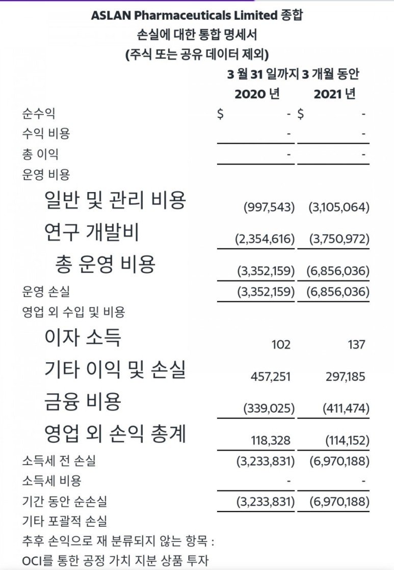 일반 및 관리 비용은 2020 년 1 분기에 미화 100 만 달러에 비해 2021 년 1 분기에 미화 310 만 달러였습니다.이 증가는 ASLAN004 및 추가 기업의 2b 단계 시험을 준비하기위한 인원수 및 인력 비용 증가로 인한 것입니다. 2021 년 1 분기에 완료된 모금 활동을 지원하기 위해 발생한 비용.