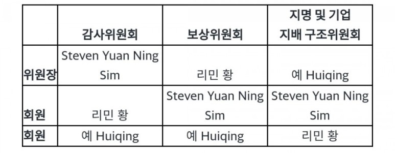 회사의 독립 이사 인 Mr. Huiqing Ye를 감사위원회 위원으로 임명하고 Steven Yuan Ning Sim을 ㅕ대신하여 지명 및 기업 지배 구조위원회 위원장으로 임명