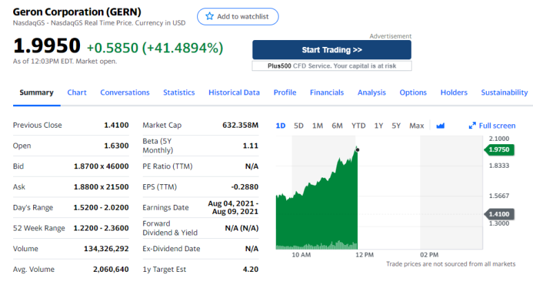 가격 행동 : GERN 주가는 금요일 마지막 수표의 개장 전 거래 세션에서 $ 1.86으로 31.9 % 상승했습니다.
