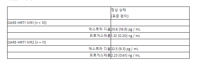 연구 데이터는 DARE-HRT1이 28 일 평가 기간 동안 에스트라 디올과 프로게스테론을 성공적으로 전달했음을 보여줍니다. 연구에서 평가 된 DARE-HRT1의 더 낮은 (IVR1) 및 더 높은 (IVR2) 용량 버전의 에스트라 디올 및 프로게스테론의 기준선 보정 정상 상태 방출은 아래 표에 표시된대로 28 일 동안 정상 상태 방출 수준을 보여주었습니다.