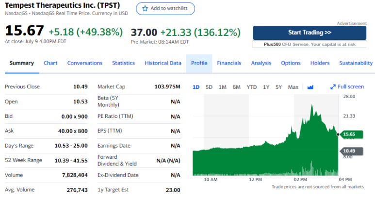 SOUTH SAN FRANCISCO, CA, 2021 년 7 월 9 일 (GLOBE NEWSWIRE)-Tempest Therapeutics, Inc. (Nasdaq : TPST), 표적 및 면역 매개를 결합한 잠재적 인 일류 치료제를 개발하는 임상 단계 종양학 회사 메카니즘은 오늘 7 월 14 일 수요일 William Blair 2021 Biotech Focus Conference에서 '차세대 면역 종양 표적을위한 치료법 개발'이라는 제목의 웹 캐스트 패널에 최고 의료 책임자 인 Sam Whiting, MD, Ph.D.가 참여할 것이라고 발표했습니다. , 2021년 오후 2시 10분(동부 표준시)