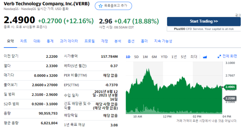 Verb Technology Company, Inc.(Nasdaq: VERB)는 기업이 고객을 유치하고 참여시키는 방식을 혁신합니다. 회사의 SaaS(Software-as-a-Service) 플랫폼은 독점적인 대화형 비디오 기술을 기반으로 하며 구독 기반으로 제공되는 판매 지원 비즈니스 소프트웨어 제품군으로 구성됩니다. 소프트웨어 응용 프로그램은 저렴하고 사용하기 쉬우며 빠른 결과를 얻을 수 있는 영업 도구가 필요한 대기업 및 중소기업 영업 팀에 60개 이상의 국가에서 48개 이상의 언어로 제공됩니다. 모바일 및 데스크톱 버전 모두에서 사용 가능한 이 애플리케이션은 독립 실행형 기반뿐만 아니라 완전히 통합된 제품군으로 제공되며 verbCRM(고객 관계 관리 애플리케이션), verbLIVE(대화형 라이브스트림 전자 상거래 및 비디오 웹 세미나 애플리케이션), verbTEAMS(소규모 기업 및 개인 기업가를 위한 내장형 verbLIVE 및 Salesforce 동기화가 있는 verbCRM의 자체 온보딩 버전), verbLEARN(학습 관리 시스템 응용 프로그램) 및 verbMAIL(Microsoft Outlook에 원활하게 통합된 대화형 비디오 메일 솔루션). 회사는 캘리포니아와 유타에 지사를 두고 있습니다. 자세한 내용은 다음을 방문하십시오.www.verb.tech .