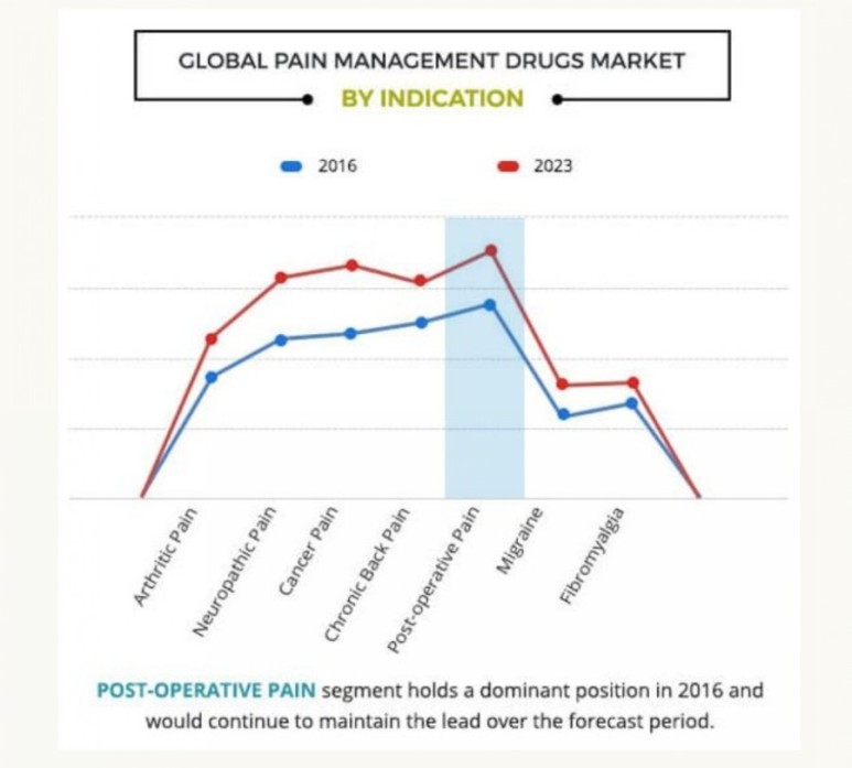 2017 년 전 세계적으로 전체 수술 후 통증 치료 시장은 US $ 12B로 추정되고 2026 년 말까지 US $ 45B의 초과 도달 할 것으로 예상된다 (1)