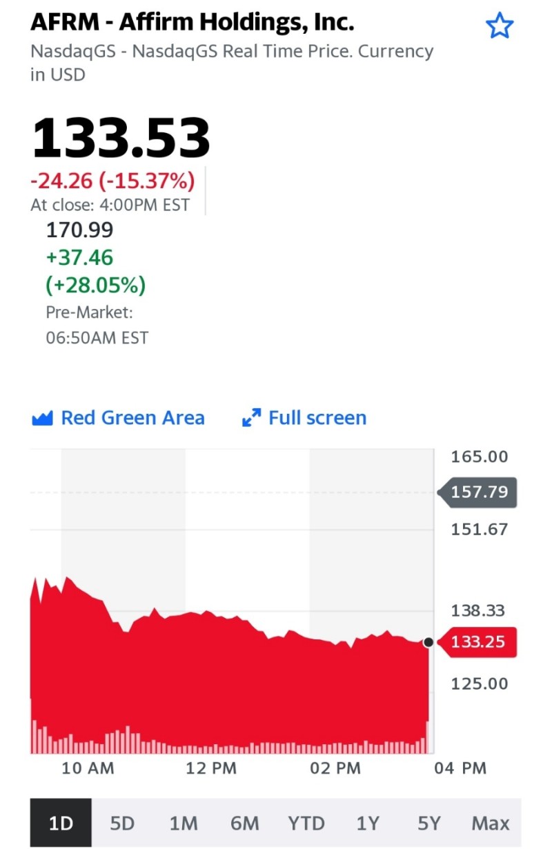 Affirm 주식은 오늘 주식 시장 에서 연장 거래에서 165.22로 거의 24%나 뛰었 습니다 . 수요일 정기 세션에서 Affirm의 주가는 광범위한 시장 매도세 속에서 15.4% 하락했습니다.