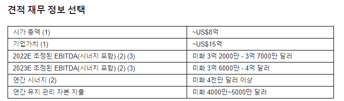 예측 2023E로 확장된 확장된 EBITDA를 시너지를 포함하여 3억 6천만 달러에서 4억 달러로 조정했습니다.