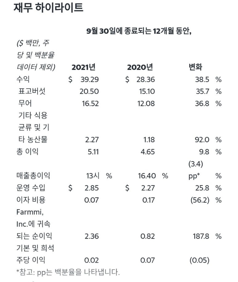 Farmmi의 회장이자 CEO인 Ms. Yefang Zhang 은 다음과 같이 덧붙였습니다. "우리는 2021년 9월 에 우리의 야심찬 다각화 및 성장 전략을 발표했습니다. 이 전략 은 강력한 플랫폼과 수요를 기반으로 구축하기 위해 노력하면서 수익과 이익 성장을 위한 더 큰 기회를 제공하도록 고안되었습니다. "중요하게, 우리의 더 강력한 대차 대조표는 더 많은 국내 및 국제 고객에게 파트너로서 Farmmi에 대한 신뢰를 더하고 유기농 사업에 대한 투자를 가속화하는 동시에 전략적 M&A 기회를 추구할 수 있게 해줍니다."