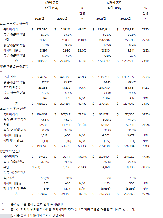 엔지니어링 구조용 커넥터 및 빌딩 솔루션의 업계 리더인 Simpson Manufacturing Co., Inc.("회사")(NYSE: SSD)는 오늘 2021년 4분기 및 전체 연도의 재무 결과를 발표했습니다. " 추가 부문 정보(회사의 아시아/태평양 부문 및 관리 및 기타 모든 부문에 대한 정보 포함)는 아래의 부문 및 제품 그룹 정보" 표를 참조하십시오.