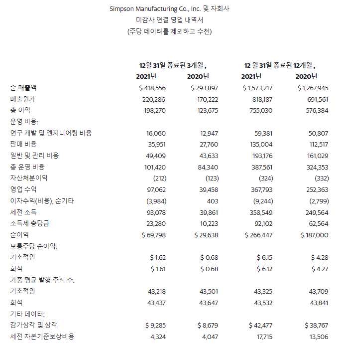 Simpson Manufacturing Co., Inc.의 최고 경영자인 Karen Colonias 는 "2021년 재무 및 운영 성과에 매우 만족합니다 . 계속되는 글로벌 공급망 제약, 철강 비용 및 가용성 증가로 인한 어려운 거시 경제 환경에도 불구하고 타이트한 노동 시장뿐만 아니라 우리는 고객의 요구를 충족시키기 위해 비즈니스 모델의 핵심 요소를 계속 제공했습니다. 그 결과 우리는 연간 15억 7000만 달러의 강력한 순매출과 61억 2000만 달러 의 수익을 달성했습니다.철강 비용 상승을 상쇄하기 위한 노력의 일환으로 연중 4번의 가격 인상을 시행함으로써 매출 성장을 뒷받침하는 희석 주당 이익. 우리의 판매는 부분적으로 환율, 가격 및 수량 증가로 인한 유럽 판매 증가를 포함하여 다양한 유통 채널 전반에 걸친 온화한 겨울 날씨와 판매량 증가에 의해 더욱 뒷받침되었습니다 ."