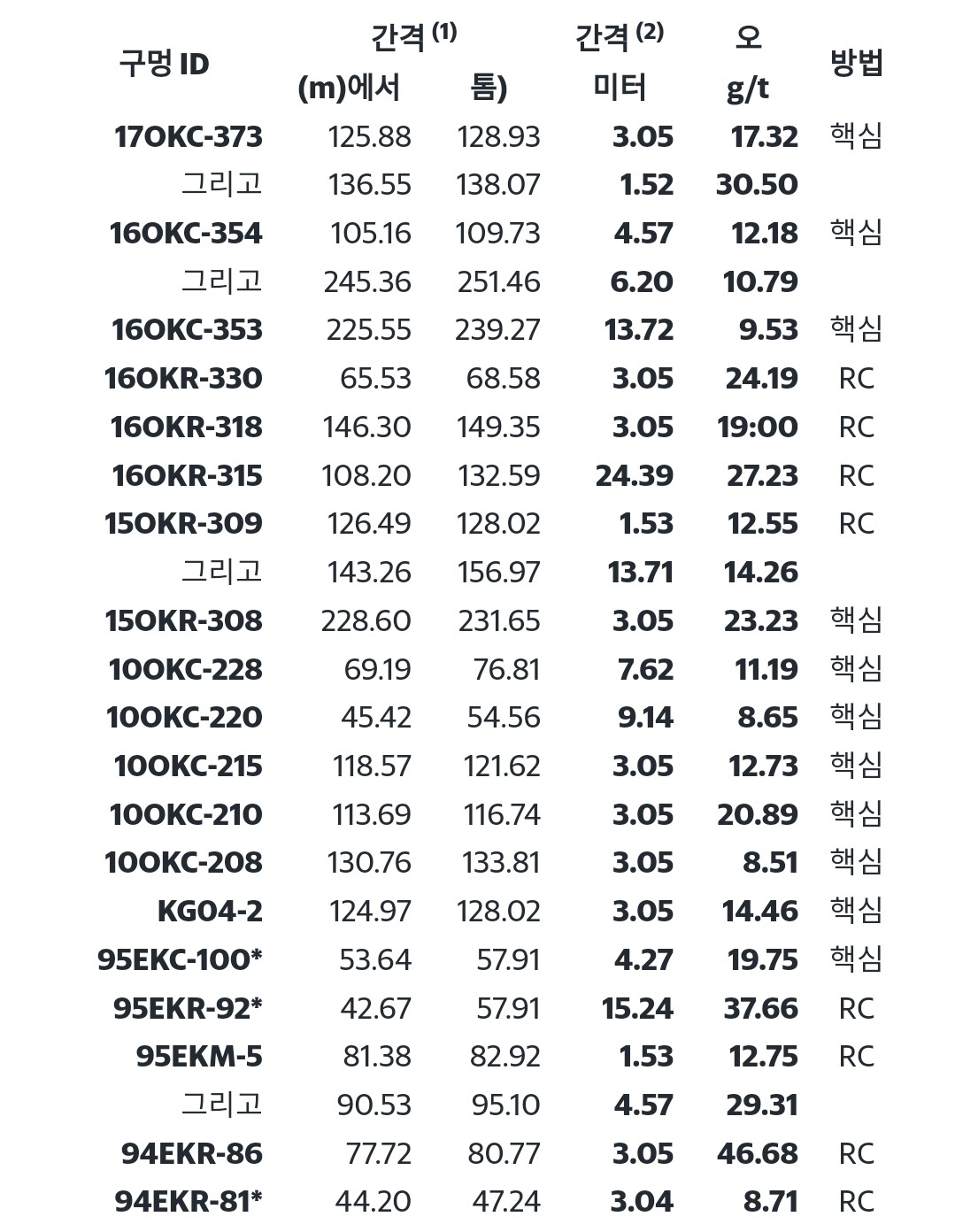 다음 표는 다이아몬드 드릴링("코어") 또는 역순환("RC")과 같이 사용된 드릴링 방법을 언급하면서 역사적인 드릴링에서 발생하고 더 넓은 범위의 저등급 광물화 내에서 보고된 높은 등급 간격을 강조 표시합니다