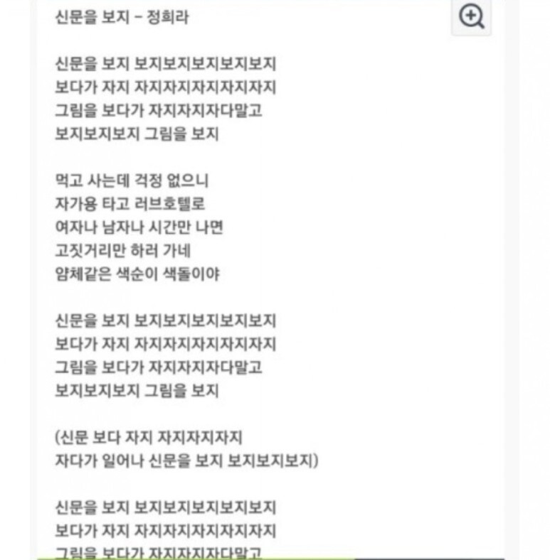 그 애들 엄마는 민망한건지 열받은건지 "시끄러워!!" 하고 다그치는데 애들은 그 다음 가사를.. 말 안해도 알거임 ㅋㅋㅋ 모르시면 정희라 신문을보지 검색해서 가사 보고 오시기를..ㅋㅋ