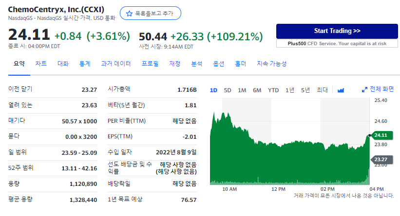 Amgen 주가는 뉴스에서 0.5% 상승한 $248.24, ChemoCentryx는 109% 상승한 $50.30였습니다.