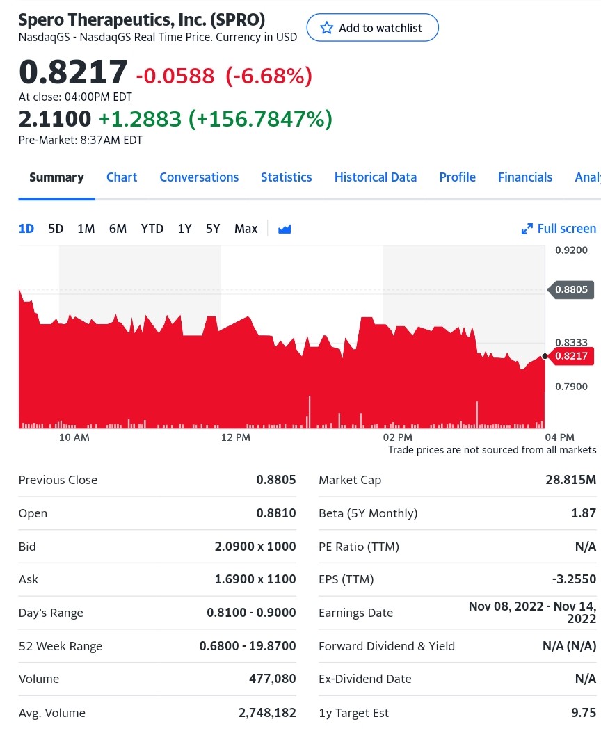 2022년 6월 30일 기준으로 Spero는 4,540만 달러의 현금, 현금 등가물 및 유가 증권을 보유하고 있습니다. 이전에 발표된 구조 조정 및 테비페넴 HBr 프로그램에 대한 상업화 활동 중단과 GSK 라이선스 거래에서 6600만 달러의 초기 현금 지불을 기반으로 Spero는 현재 현금 활주로가 2024년 이후에도 회사 자금을 조달하기에 충분할 것이라고 믿습니다.