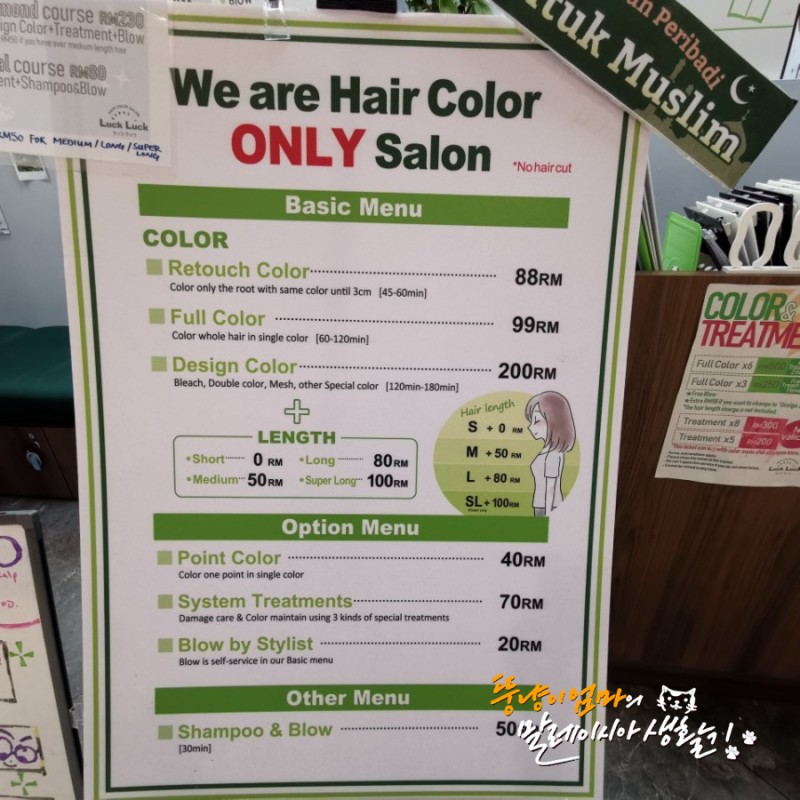 어디서 많이 보던게 있네하고 싶었더니.... 일본계 염색전문 헤어샵이었다.아이디어 좋다. 리터치는 88링깃,풀컬러는 99링깃이다. 싸다고 속지말자, 기장요금은 따로 받는다 ㅎㅎ