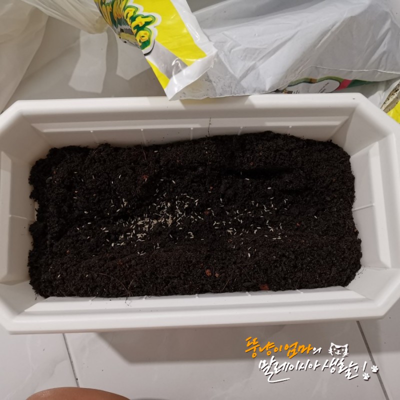 나지막한 화분에 우리 치즈가 먹을 캣글라스도 꽉꽉 채워주고 끝! 무럭무럭 자라다오!