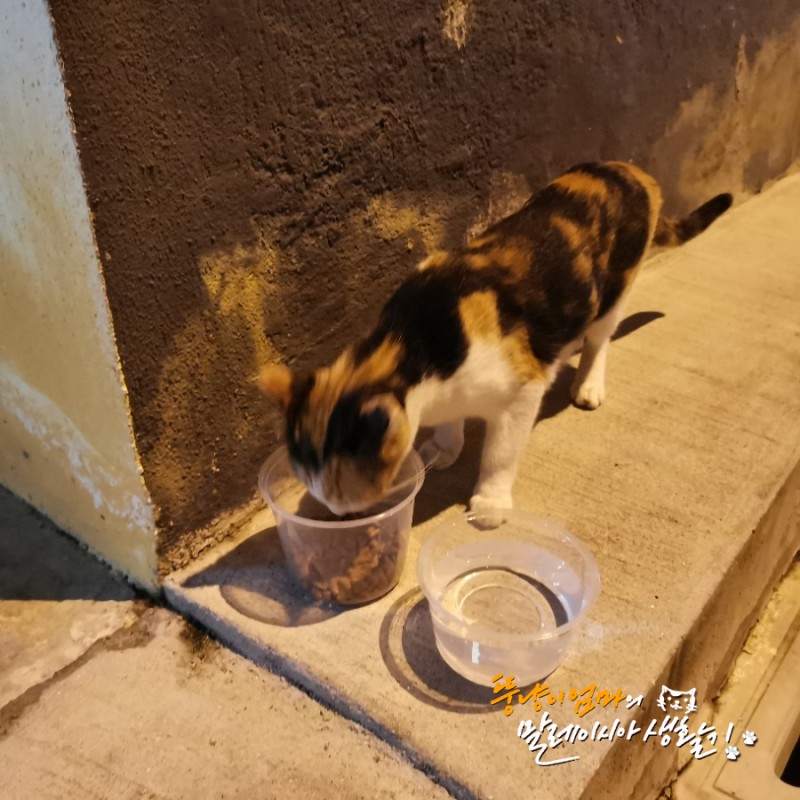 배가 고플지도 모른단 생각이 들어, 집에가서 얼른 사료와 정수기 물을 가져왔다. 세상에 ㅠ 쉬지도 않고 먹는다. 내가 빨리 알아채지 못해서 미안해...