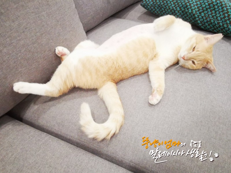 최근 알게된건데, 고양이가 편안한 상태에서는 꼬리를 우산 손잡이 모양처럼 만드는 듯하다. 침대나 쇼파에서 잘때 꼭 저렇게 만들더라.