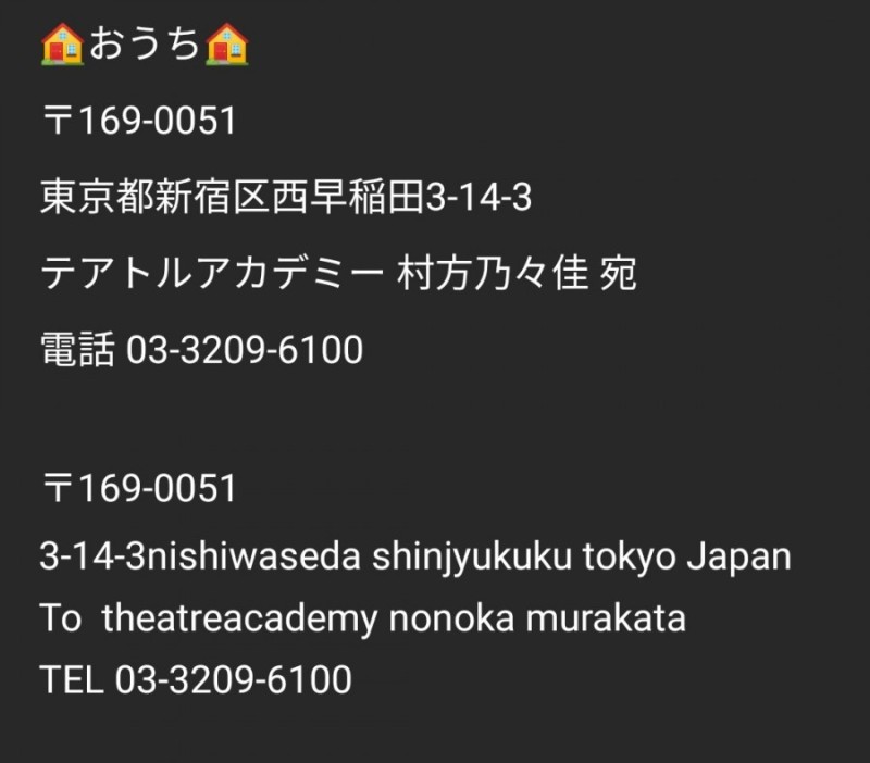 노노카짱 유튜브 채널 더 보기란을 클릭하면, 집(おうち)라고 표기 된 곳이 있어 선물이나 편지를 보낼 수 있다. 그런데 이 곳은 사실 집주소가 아니다. [테아토레 아카데미] 라고 라는 아역을 전문으로 육성하는 40년 전통을 가진 종합예능학원으로, 보통 자녀를 연예계로 진출시키고자 하는 부모들이 보내는 곳이며, 일본 내에 10개의 지점이 있다.