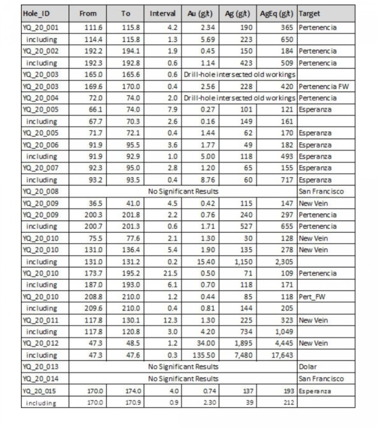 우리는 2020 년 4 분기에 3,400 미터, 15 홀 드릴 프로그램을 완료하여 Yoquivo의 주요 정맥을 탐색했습니다. 탐사 프로그램은 금-은 광물의 특성과 분포를 더 잘 이해하기 위해 Pertenencia, San Francisco 및 Esperanza 정맥 시스템을 대상으로 설계되었습니다. 상당한 관심을 끄는 것은 Pertenencia 정맥과 평행하고 동쪽에있는 새로운 정맥 의 발견입니다. 다른 주요 광맥은 샌프란시스코와 페르 테넨 시아의 경우 표면에서 수면까지 (최대 130 미터) 부분적으로 채굴되었으며, 새로운 광맥 인 El Dolar 및 Esperanza의 경우 훨씬 덜 광범위한 수직 간격에 걸쳐 채굴되었습니다. 표면에서 채굴되지 않습니다. 주요 내용은 다음과 같습니다.