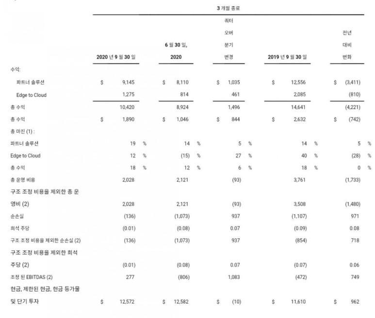 2020 년 3 분기 수익은 $ 1,040 만, 위로 $ 150 만 수익 증가는 파트너 솔루션 부문의 매출 증가와 엣지-클라우드 부문의 서비스 매출 증가에 의해 주도되었습니다.