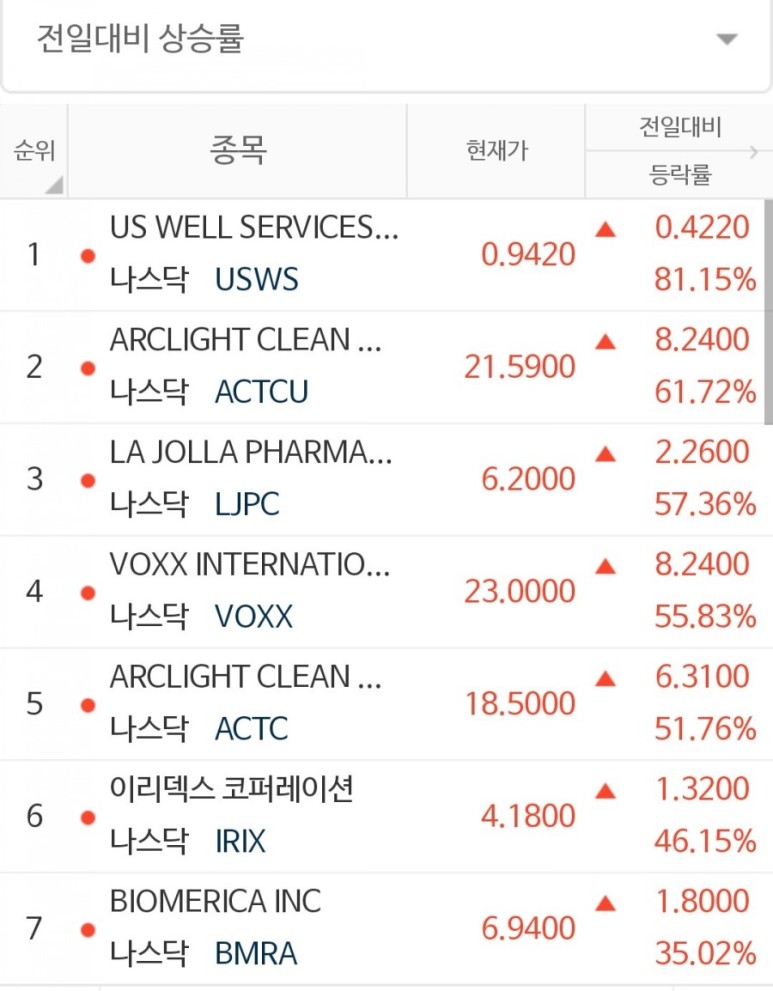안녕하세요. 옆집 세라입니다. 오늘의 전일대비 상승율 1위는 US Well Services Inc 가 되겠습니다.