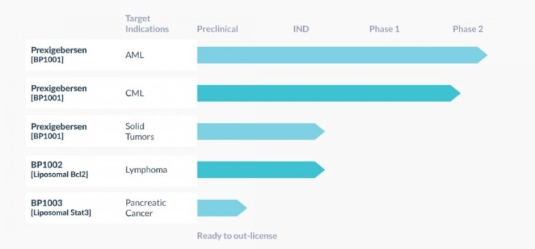 주요 제품 후보 인 prexigebersen (Liposomal Grb2), 이전 BP1001, 혈액 암 클리닉 및 고형 종양 개발 중. 두 번째 제품 후보 인 BP1002 (Liposomal Bcl2)는 IND 지원
