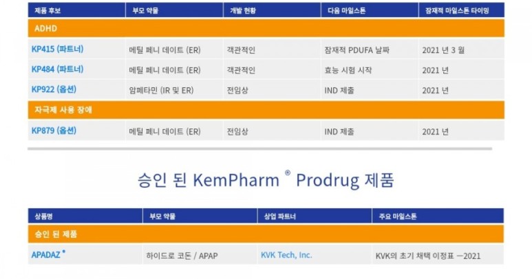 KemPharm은 독점적 인 LAT ® (Ligand Activated Therapy) 기술을 통해 심각한 의학적 상태를 치료하기위한 독점 프로 드럭의 발견 및 개발에 주력하는 전문 제약 회사 입니다. KemPharm은 독점적 인 LAT ®FDA 승인 약물의 개선 된 전구 약물 버전을 생성하고 새로운 질병 적응증에 적용 할 수있는 기존 화합물의 전구 약물 버전을 생성하는 기술. KemPharm의 프로 드러그 제품 후보 파이프 라인은 주의력 결핍 과잉 행동 장애 (ADHD) 및 각성제 사용 장애의 높은 요구 영역에 초점을 맞추고 있습니다. ADHD, KP415 및 KP484 치료를위한 KemPharm의 공동 선도 임상 개발 후보는 둘 다 d- 메틸 페니 데이트 프로 드럭을 기반으로하지만 기간 / 효과 프로필이 다릅니다. 또한 KemPharm은 benzhydrocodone , hydrocodone의 전구 약물 및 acetaminophen을 함유 한 즉시 방출 형 복합 제품인 APADAZ ®에 대한 FDA 승인을 받았습니다 .