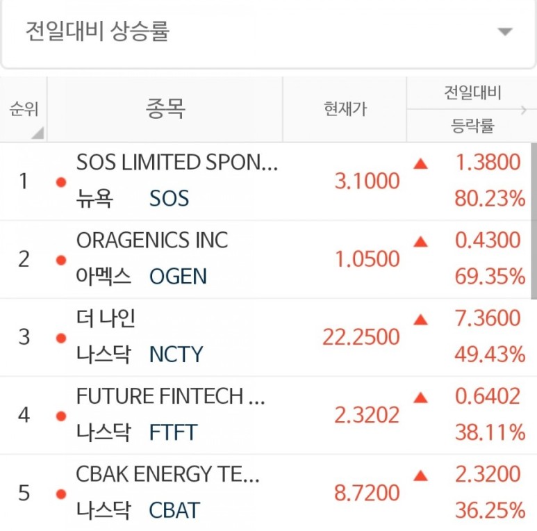 안녕하세요. 옆집 세라입니다. 오늘의 전일대비 상승율 1위는 SOS Ltd가 되겠습니다.