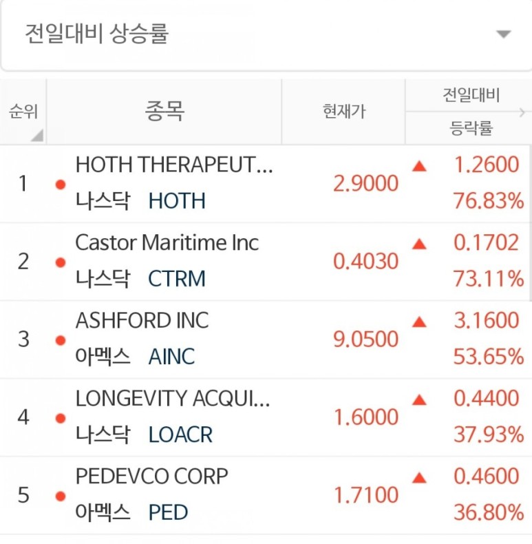안녕하세요. 옆집 세라입니다. 오늘의 전일대비 상승율 1위는 Hoth Therapeutics Inc가 되겠습니다.