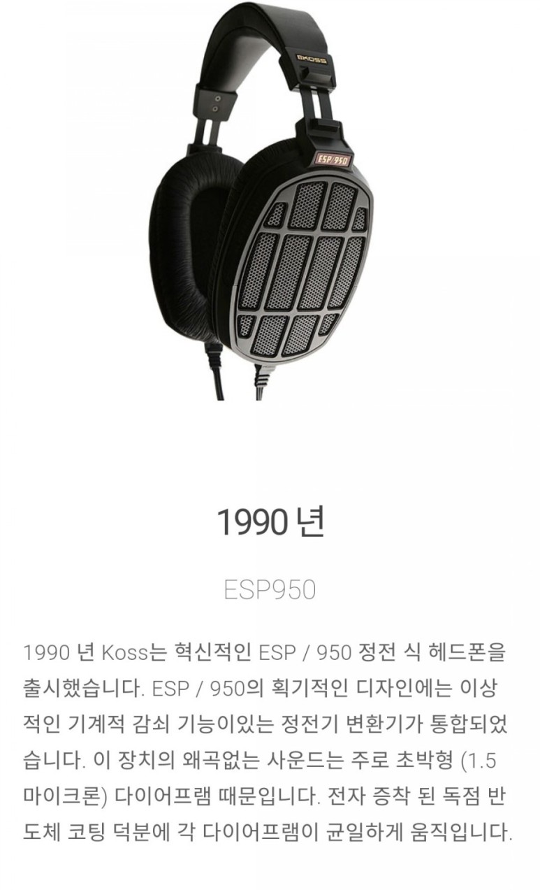 1968 년 Koss는 세계 최초의자가 에너지 정전 식 헤드폰 인 ESP / 6을 출시했습니다. 전례없는 사운드 프로파일을 달성하기 위해 ESP / 6은 무 전류 또는 정전기 전하의 원리를 사용했습니다. 이 전하는 푸시-풀 콘덴서 플레이트에 적용되어 초경량 전도성 다이어프램이 움직였습니다.