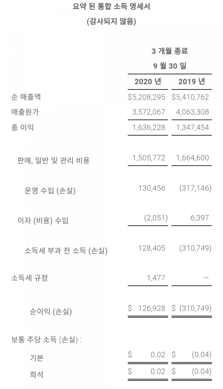 1 분기 매출은 5,208,295 달러로, 1 년 전 같은 3 개월 동안의 매출 5,410,762 달러에서 3.7 % 감소했습니다. 3 개월 순이익은 126,928 달러로 작년 1 분기에 310,749 달러의 순손실을 기록했다. 1 년 전 같은 3 개월 동안의 보통 주당 희석 및 기본 소득은 $ 0.04의 보통 주당 손실에 비해 0.02 달러였습니다.