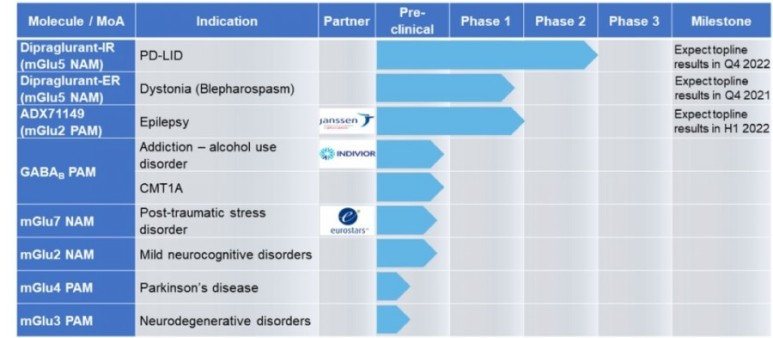 Addex의 주요 약물 후보 인 dipraglurant (mGlu5 음성 알로 스테 릭 조절제 또는 NAM)는 2021 년에 파킨슨 병 레보도파 유발 성 운동 이상증 (PD-LID)에 대한 중추적 등록 임상 시험을 시작할 준비가되어 있습니다. 또한 Addex는 안검 경련 (일종 2021 년에 임상 시험이 시작될 것으로 예상됩니다.
