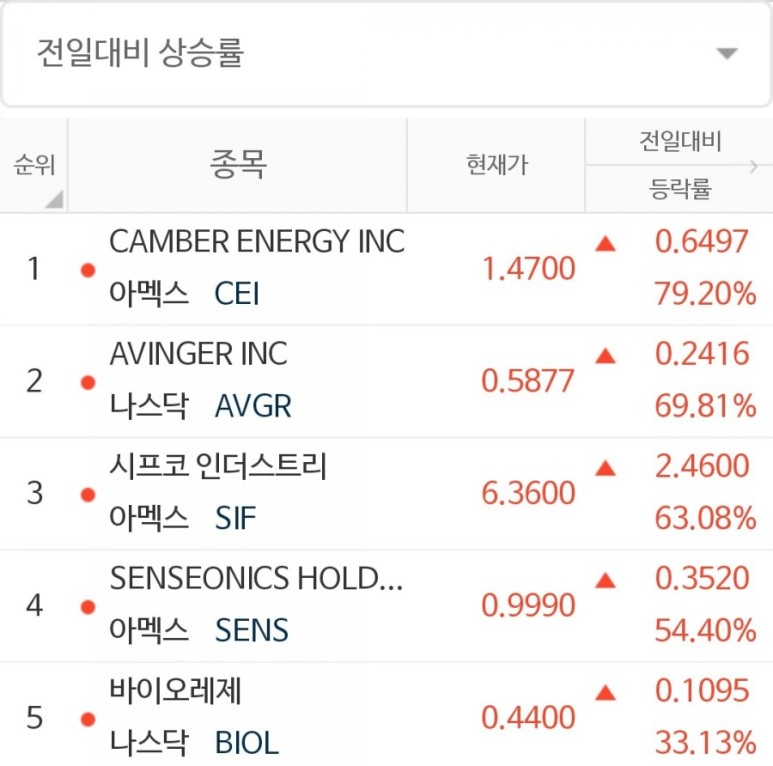 안녕하세요. 옆집 세라입니다. 오늘의 두번째 전일대비 상승율 1위는 Camber Energy Inc가 되겠습니다.하지만 곧 Senseonics Holdings Inc 가 치고 올라올거같은 느낌적인 느낌? ㅋ