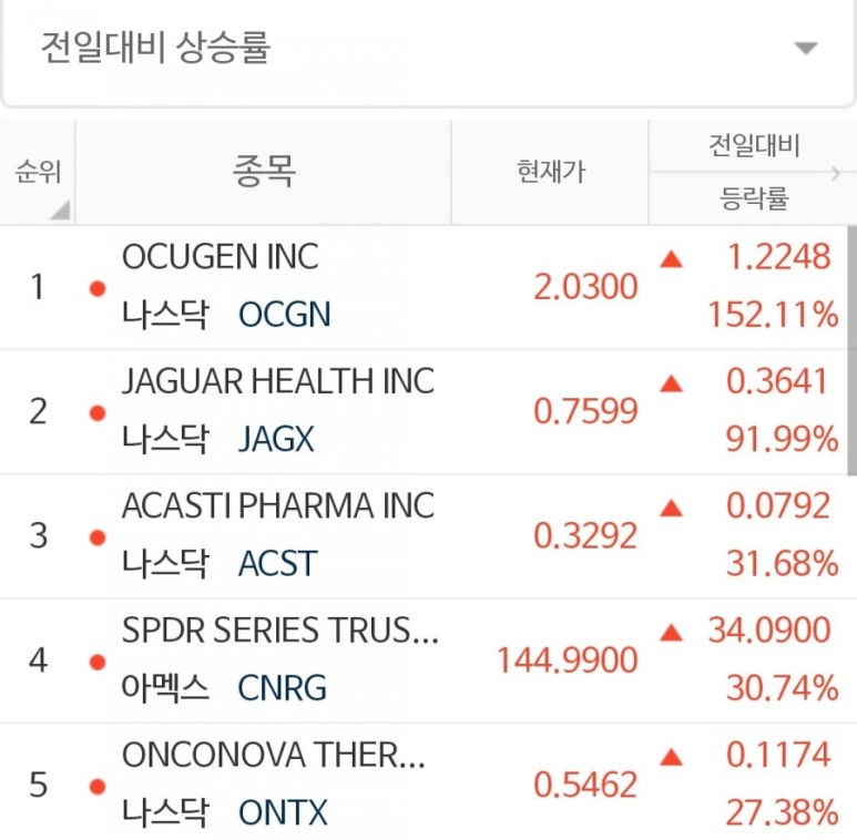 안녕하세요. 옆집 세라입니다. 오늘의 전일대비 상승율 1위는 Ocugen Inc 가 되겠습니다.