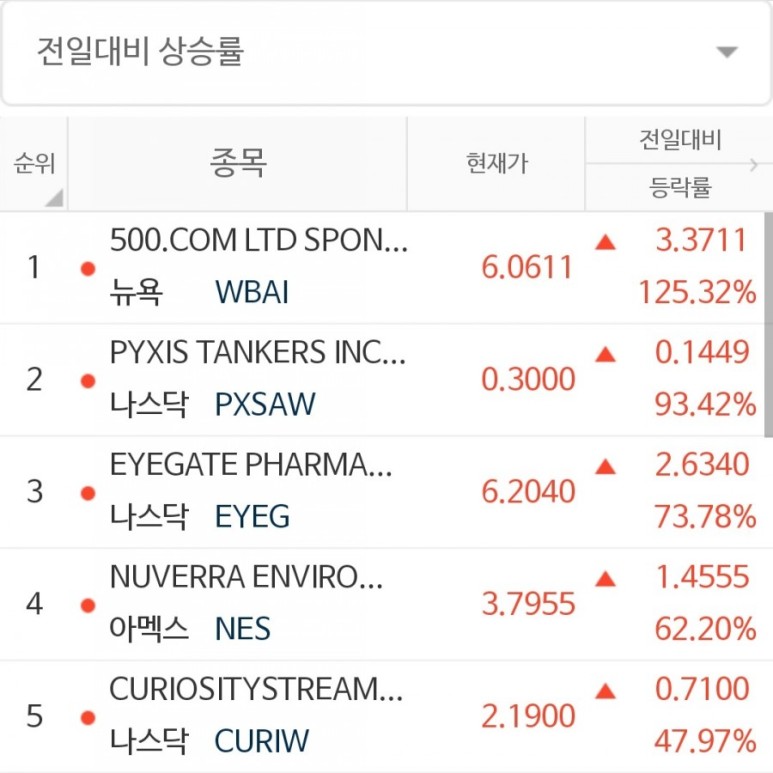 안녕하세요. 옆집 세라입니다. 오늘의 두번째 전일대비 상승율 1위는 500.Com Ltd 가 되겠습니다.