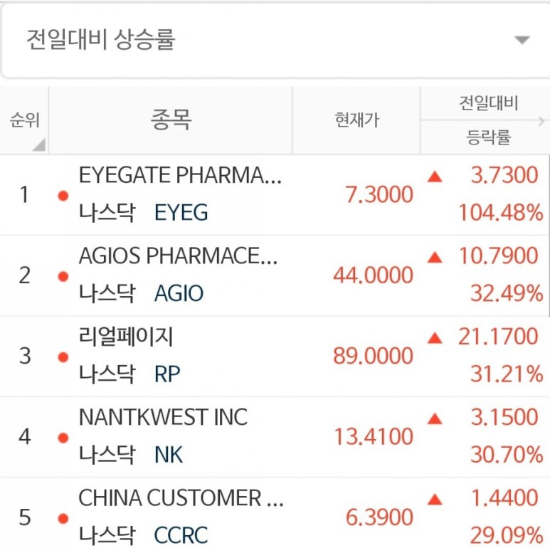안녕하세요. 옆집 세라입니다. 오늘의 전일대비 상승율 1위는 Eyegate Pharmaceuticals Inc 가 되겠습니다.