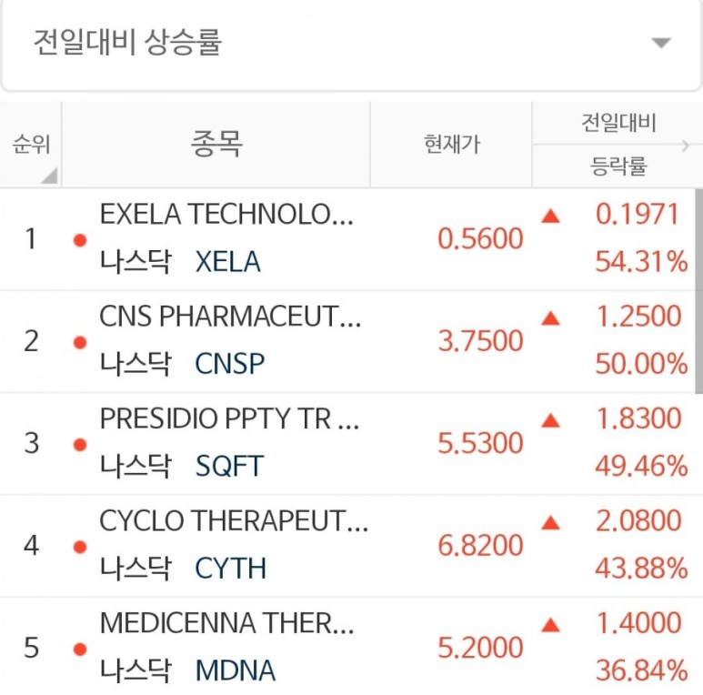 안녕하세요. 옆집 세라입니다. 오늘의 전일대비 상승율 1위는 Exela Technologies Inc 가 되겠습니다.