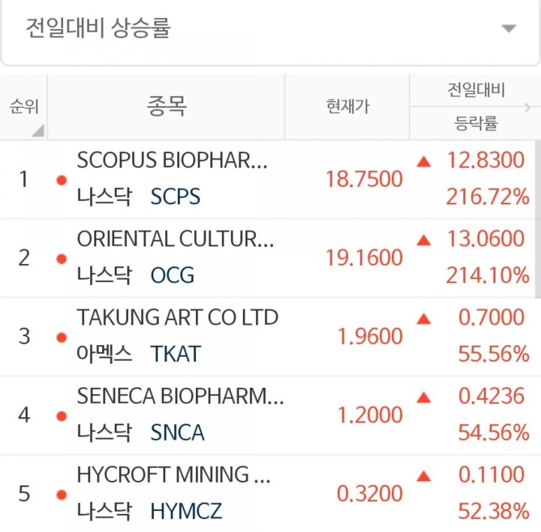 안녕하세요. 옆집 세라입니다. 오늘의 전일대비 상승율 1위는 Scopus Biopharma Inc 입니다.