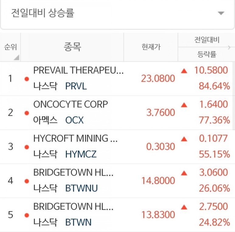 안녕하세요. 옆집 세라입니다. 오늘의 전일대비 상승율 1위는Prevail Therapeutics Inc 가 되겠습니다.