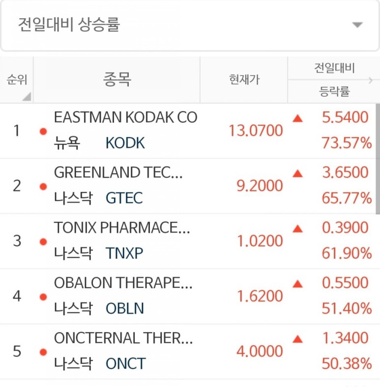 안녕하세요. 옆집세라입니다. 오늘의 전일대비 상승율 1위는 Eastman Kodak Company가 되겠습니다.