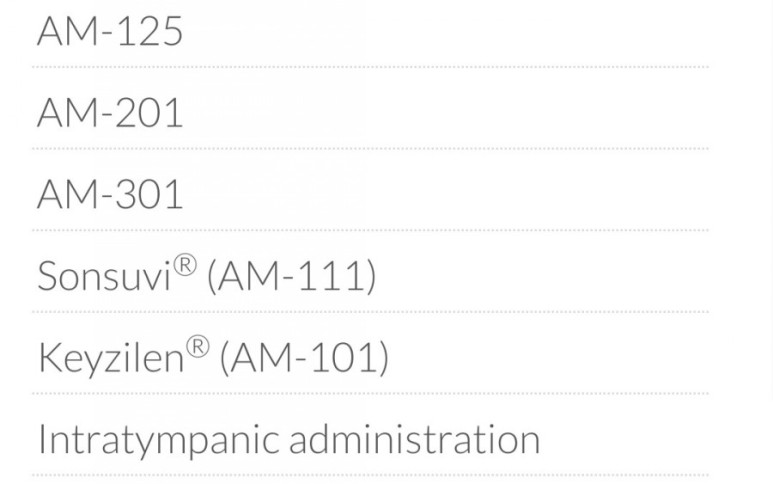 또한 Auris Medical은 급성 내이 청력 상실을위한 Sonsuvi® (AM-111)와 급성 내이 이명을위한 Keyzilen® (AM-101)의 두 가지 3 상 프로그램을 개발 중입니다.