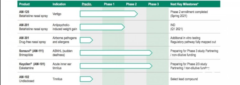 현기증 치료 (AM-125, 2 상) 및 항 정신병에 의한 체중 증가 및 졸음 예방 (AM-201, 1b 상 이후)을위한 비내 베타 히 스틴 개발에 초점을 맞추고 있습니다. 제휴사 인 Altamira Medica를 통해 공기 중 병원균 및 알레르겐 (AM-301)으로부터 보호하기위한 비강 스프레이를 개발하고 있습니다.