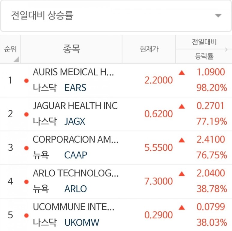 안녕하세요. 옆집 세라입니다. 그새 역전을 했네요. 오늘의 두번째 전일대비 상승율 1위는 Auris Medical Holding Ltd가 되겠습니다.