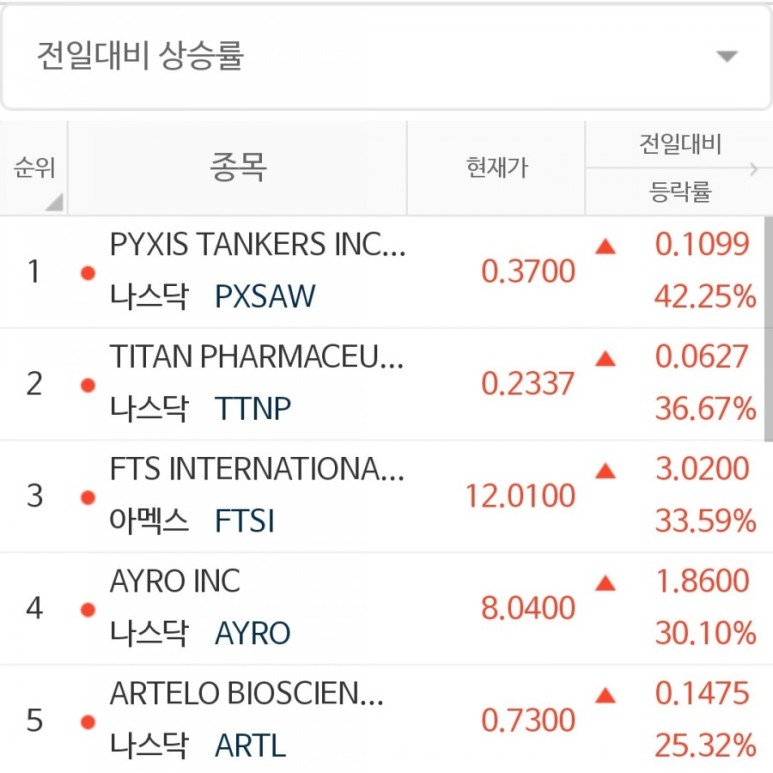 안녕하세요. 옆집 세라입니다. 오늘의 전일대비 상승율 1위는 Pyxis Tankers Inc.가 되겠습니다.