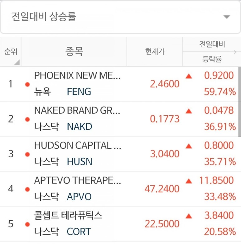 안녕하세요. 옆집 세라입니다. 오늘의 전일대비 상승율 1위는 Phoenix New Media Limited 가 되겠습니다