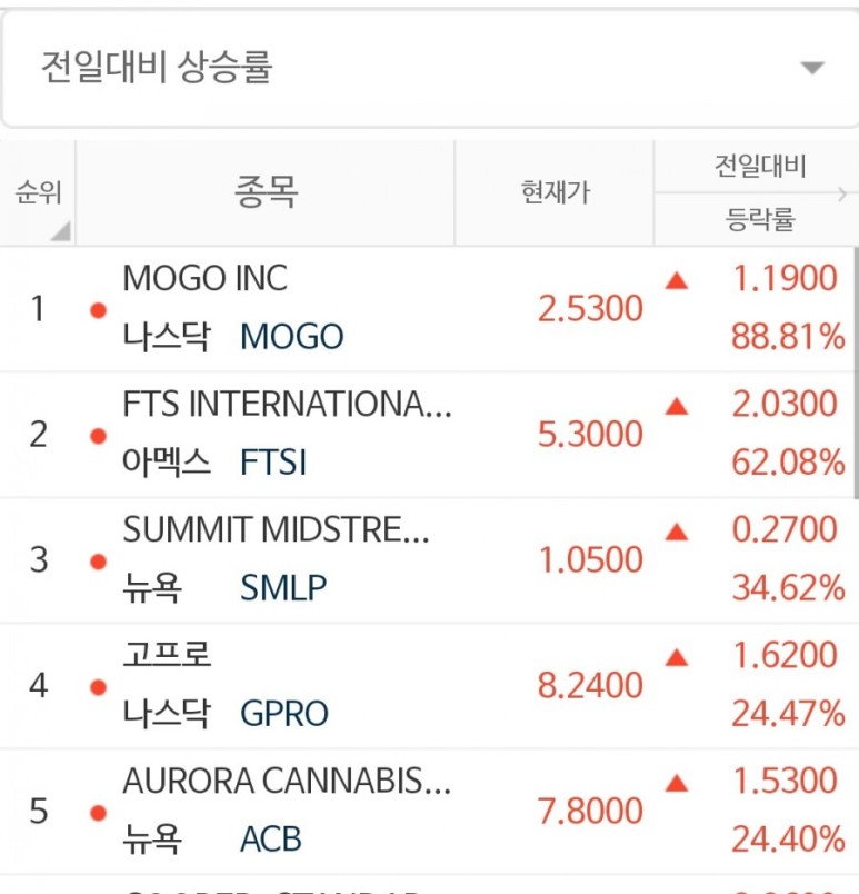안녕하세요. 옆집 세라입니다. 오늘의 전일대비 상승율 1위는 MOGO INC 가 되겠습니다.