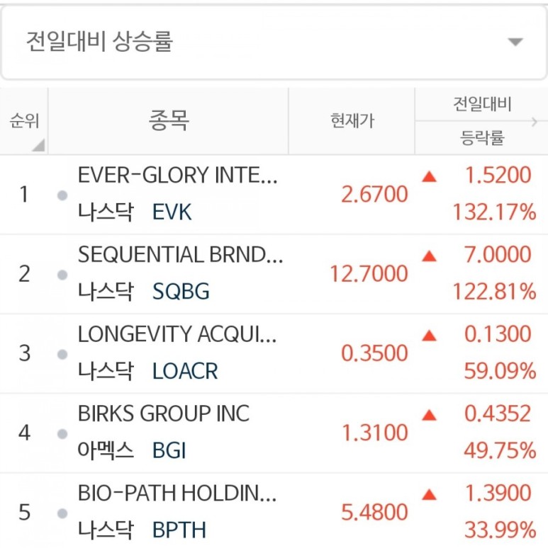 안녕하세요. 옆집 세라입니다. 오늘의 전일대비 상승율 1위는 Ever-Glory International Group이 되겠습니다. 이번에도 중국기업이군요!