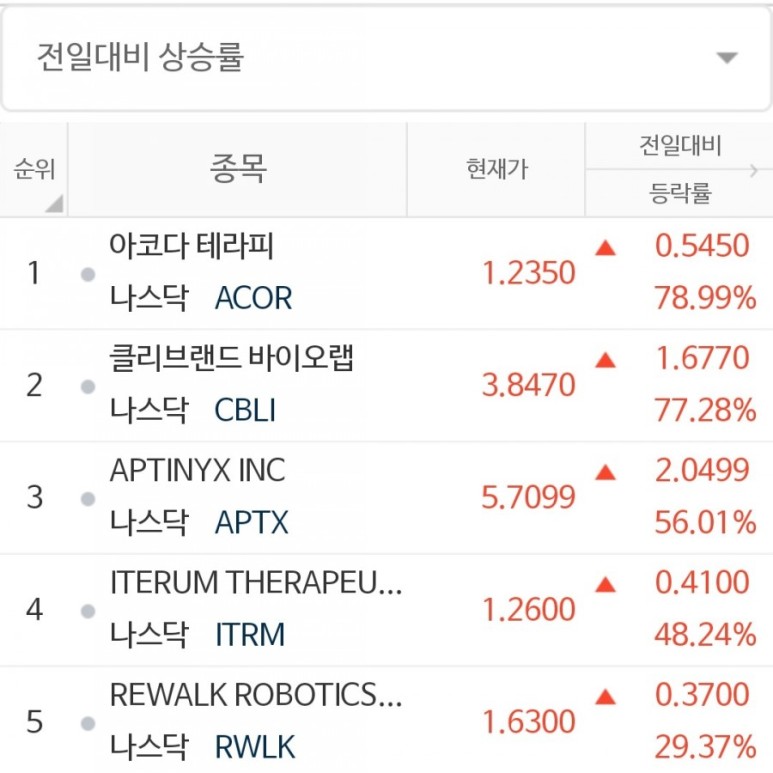 그새 역전했네요. 오늘 새롭게 전일대비 상승률 1위를 차지한 아코다 테라피가 되겠습니다..... 라고 생각했으나, 11시 24분 현재 또 역전해서 클리브랜드 바이오랩이 1위를 해버렸네요 ㅎㅎ