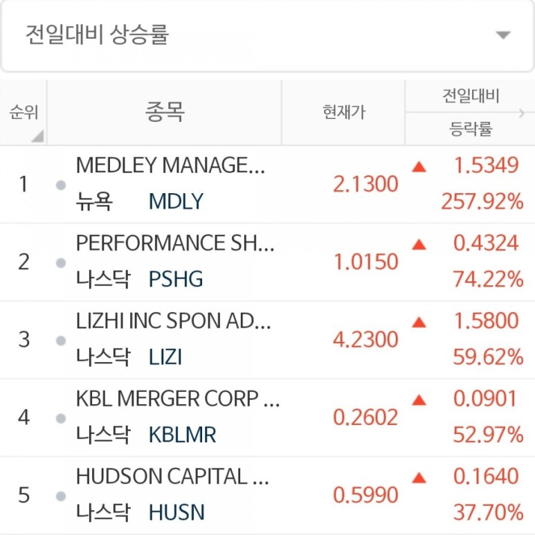 오늘의 미국 주식 전일대비 상승율 1위는 Medley Management Inc가 되겠습니다.