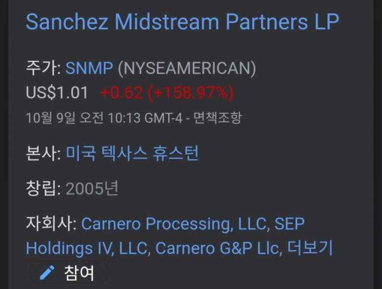 오늘의 전일대비 상승율 1위을 차지한 미국 기업은 Sanchez Midstream Partners LP에 대해 알아보도록 하겠습니다. 무려 264.86% 상승을 기록했습니다.